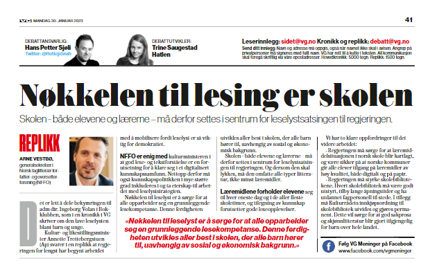 VG publiserer i dag en replikk fra NFFO i en pågående debatt om leselyst blant ungdom.